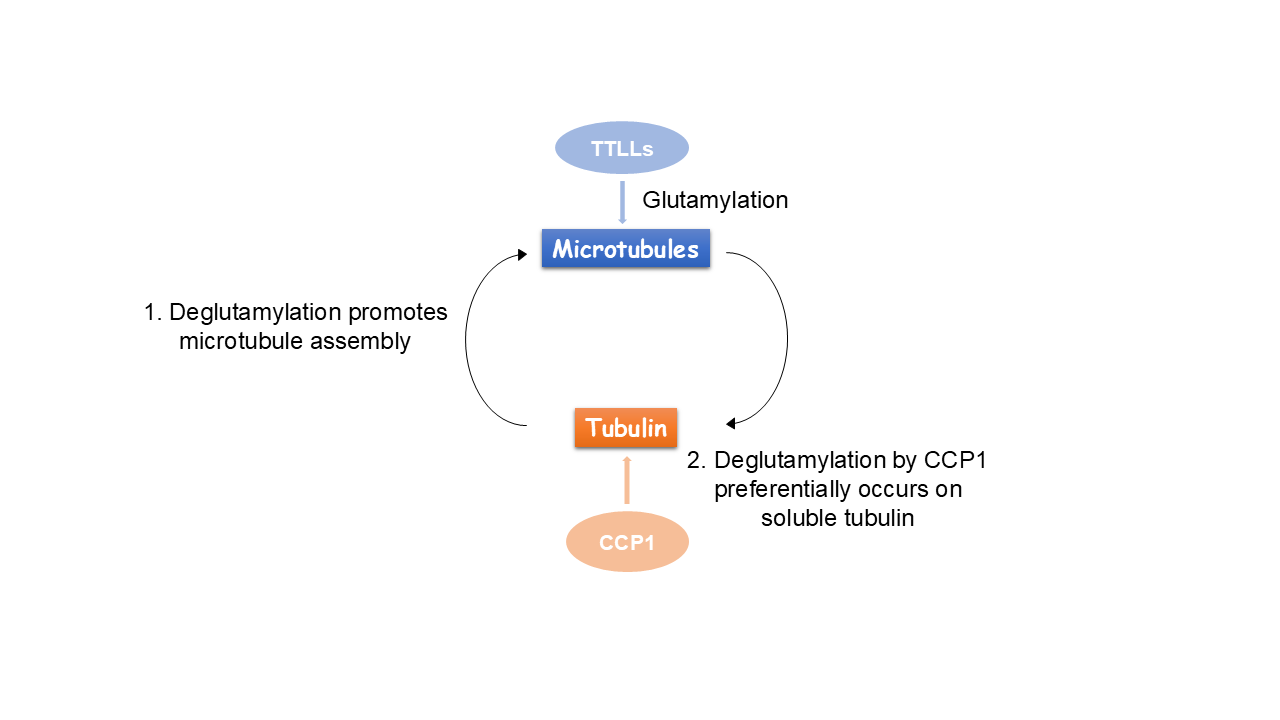 Glutamylation, the addition of glutamates to the tubulin tails, is another hallmark for stable microtubules. It is a dynamic process where the modification is written by TTLL enzymes and erased by CCP enzymes. We found that glutamylated microtubules grow slower and are less stable, suggesting that the stabilization effect observed in cells is due to effectors. In addition, we found that glutamate removal by CCP1 occurs preferentially on soluble tubulin, unlike TTLLs that prefer modifying microtubules. This substrate preference establishes an asymmetry that is central to glutamylation homeostasis: deglutamylation of soluble tubulin by CCP1 promotes polymerization into microtubules and TTLL glutamylation of microtubules regulates their function through recruitment of effectors.