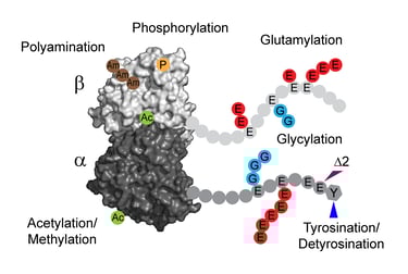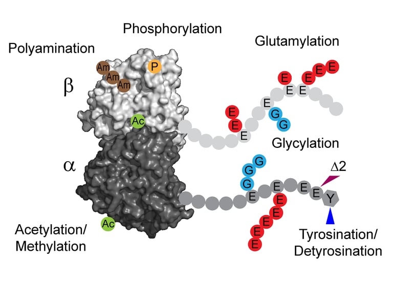 Cellular microtubules are regulated by the “tubulin code”, diverse posttranslational modifications that modulate their dynamics and architecture. Analogues to the histone code, tubulin code plays crucial roles in controlling and reorganizing the microtubule cytoskeleton in essential processes such as cell division, migration, and intracellular transport. Dysregulation of these modifications leads to a broad range of diseases, including cancers, neurodegeneration, ciliopathies, and cardiomyopathies.